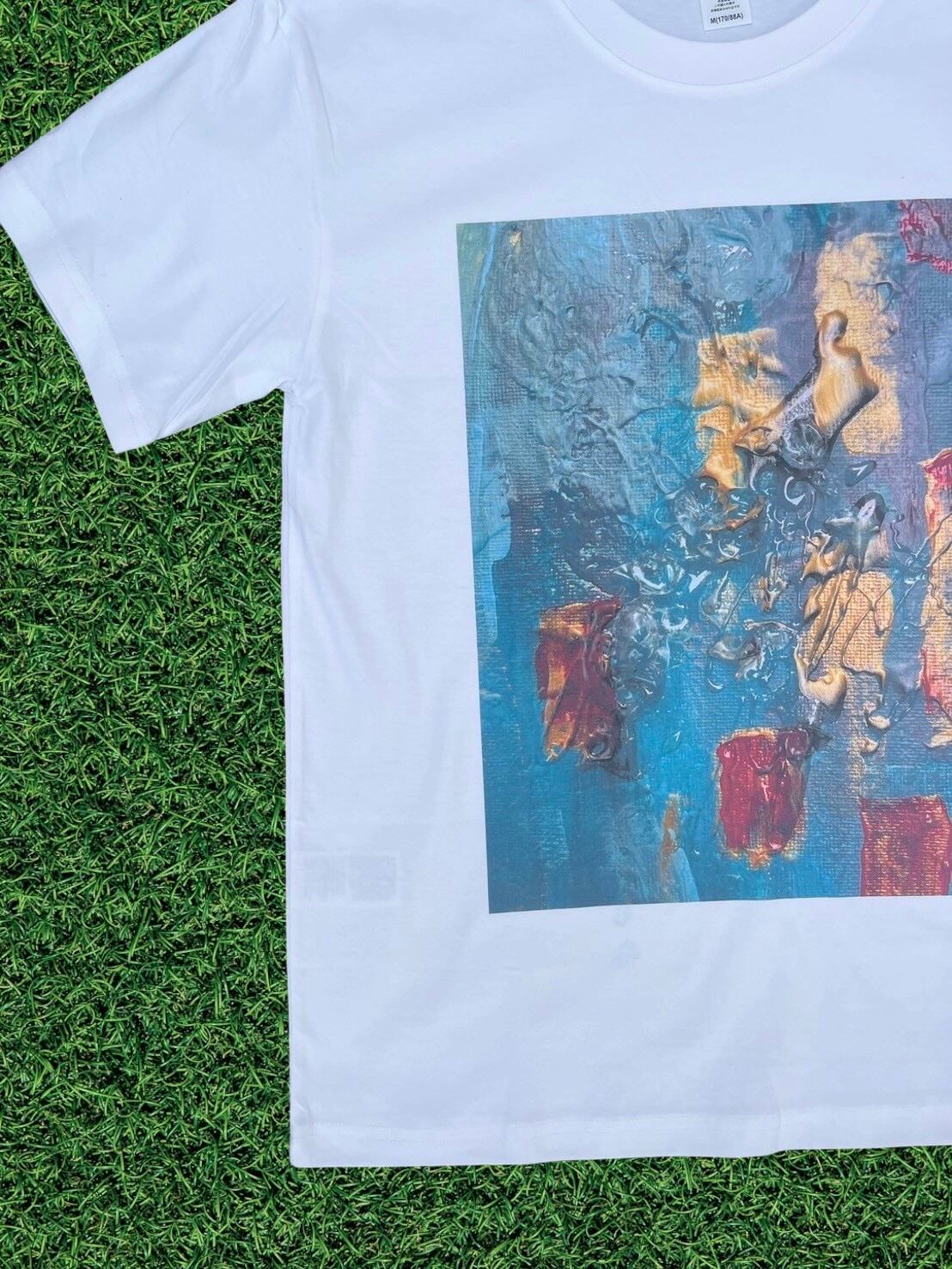 シンプルなシルエットにアートのアクセントが映える一枚です。