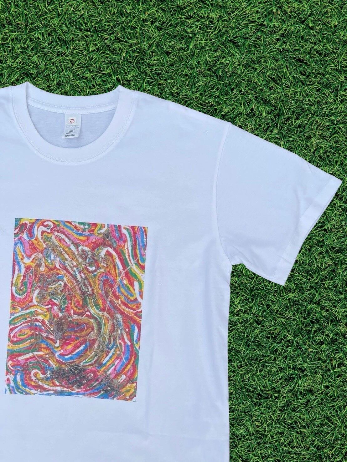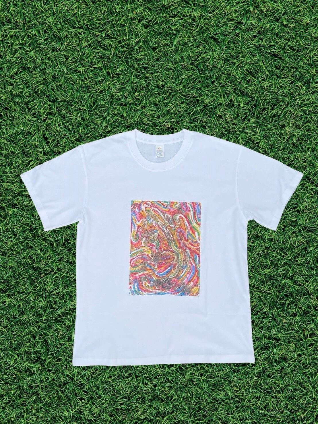 シンプルなシルエットにアートのアクセントが映える一枚です。